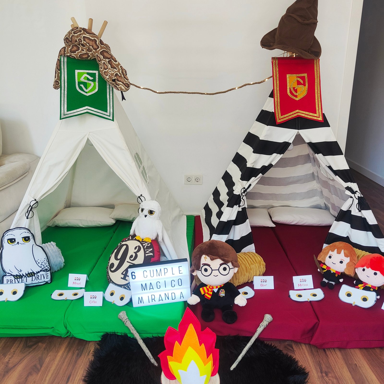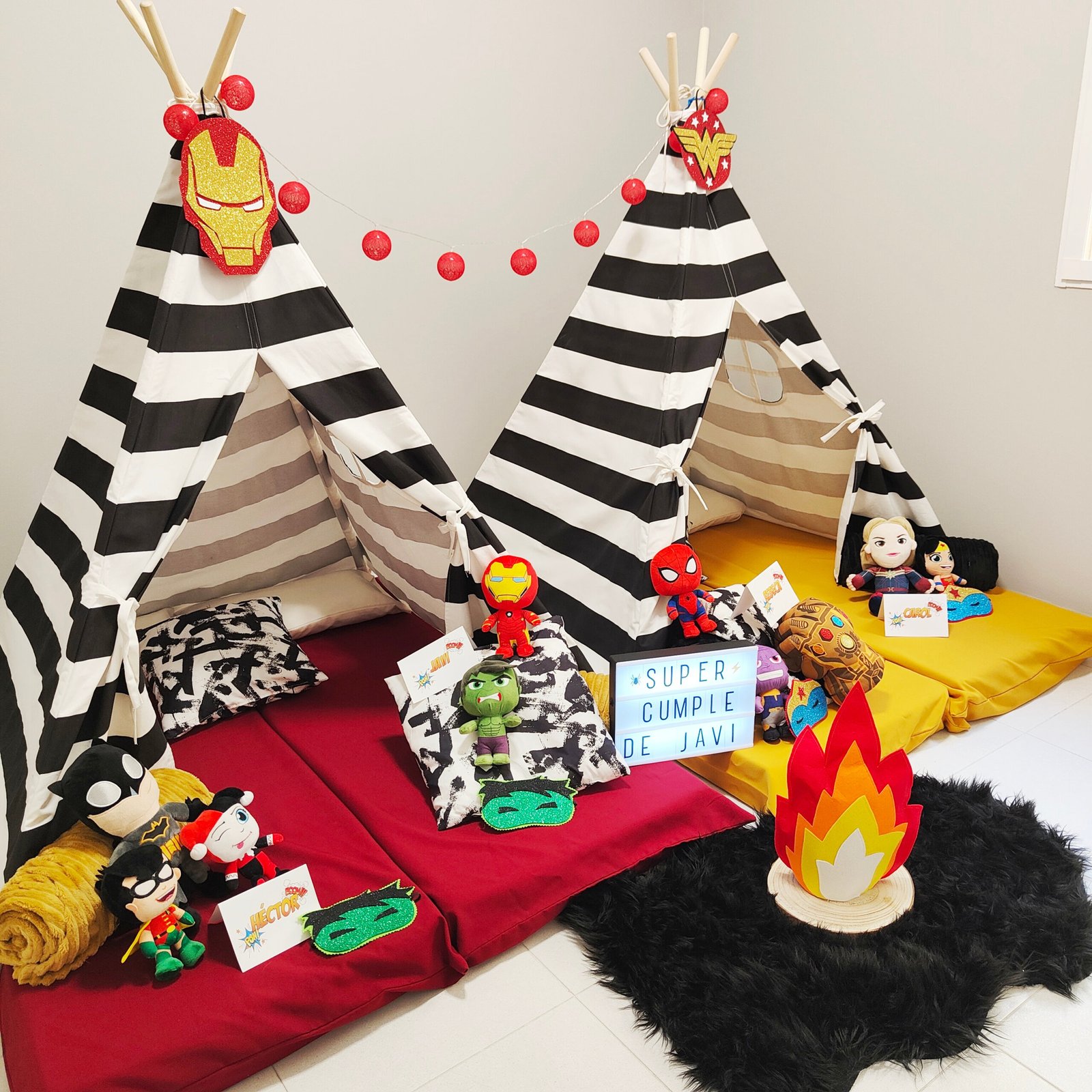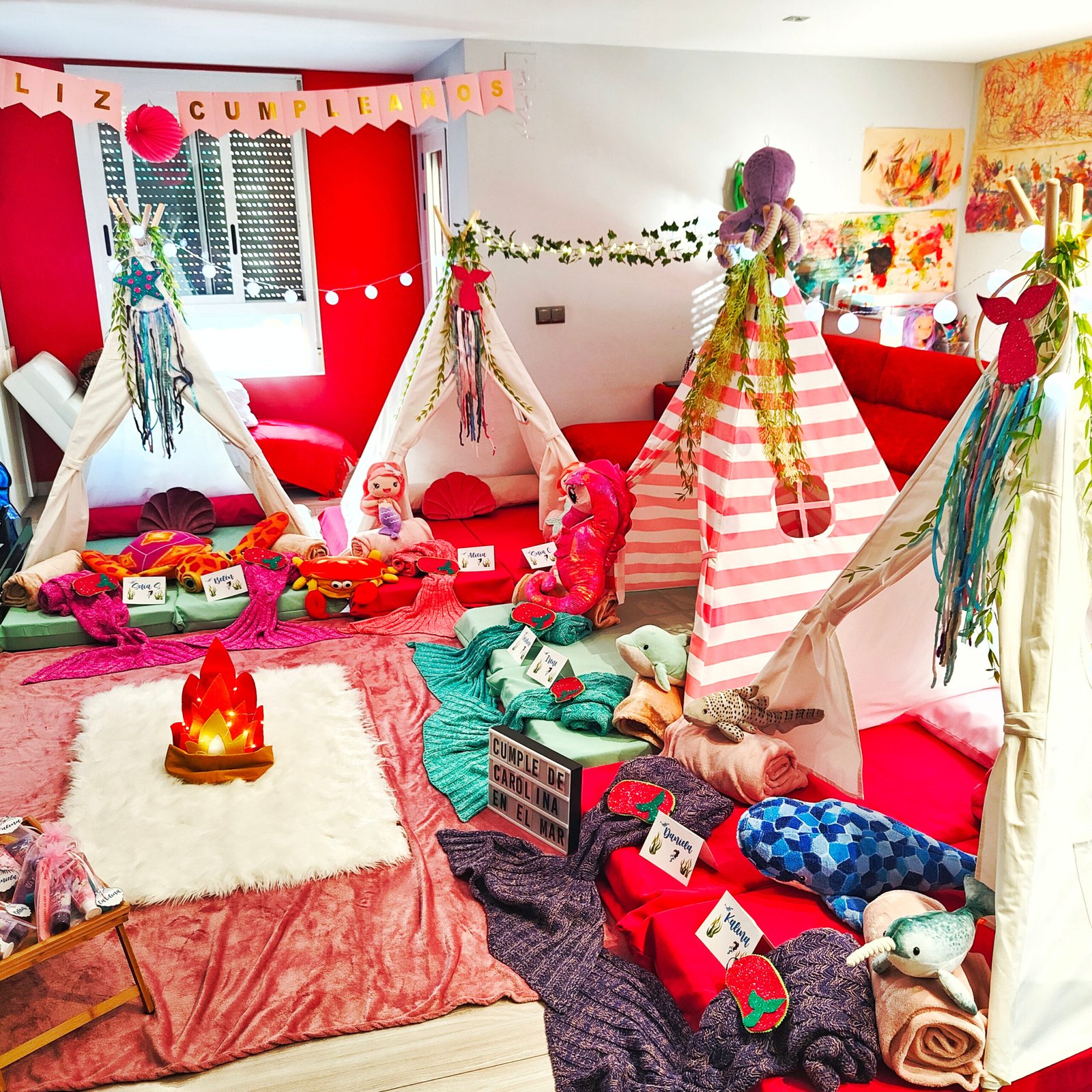 Montamos tipis decorados con luces, mantas y temáticas personalizadas para que cada peque tenga su propio rincón especial.